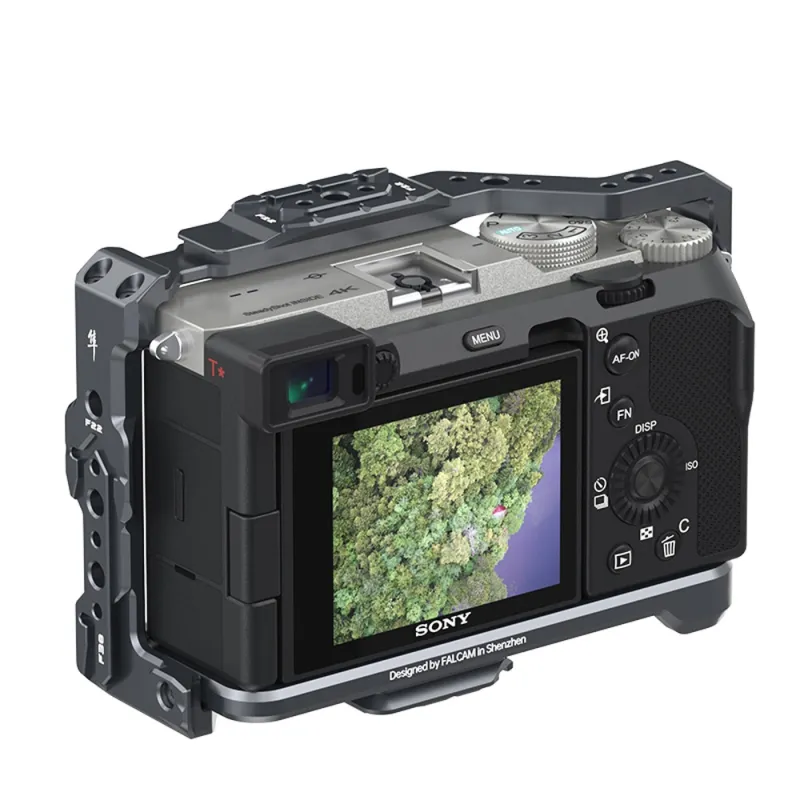 Falcams 2737 Quick Release Camera Cage maintains access to the cameras buttons and it also remains possible to open the battery compartment.
