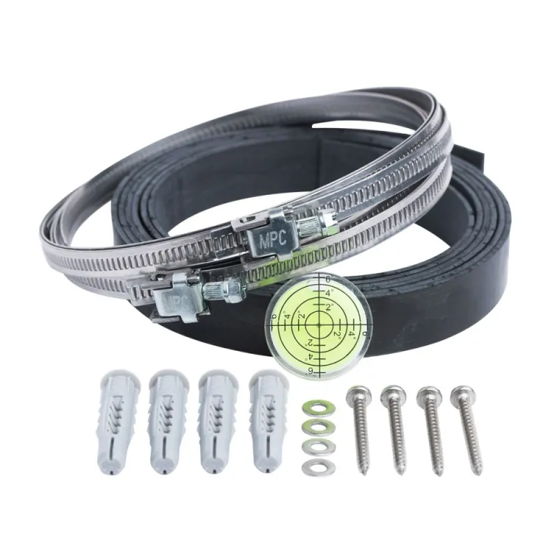 The metal clamps are adjustable and are used to hold the arm on round, rectangular, triangular structures, any polygon in fact within a perimeter of 1099 mm max or diameter 350 mm. They can be tightened with a flat or cross-headed screwdriver or a 7 mm spanner. Then the excess length can be cut off with a pair of pliers. The rubber bands are to protect the support on which the clamps will be placed. They can also be cut to length with a cutter/scissors… (not included)