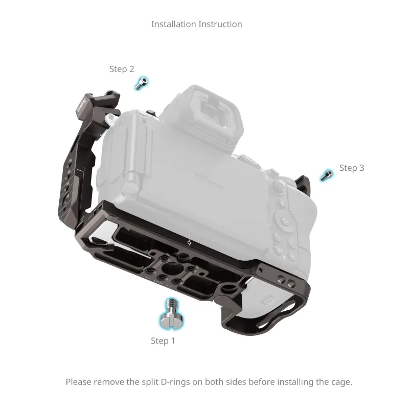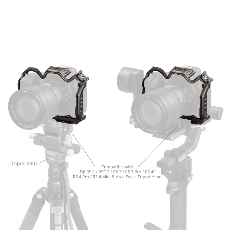 Designed to provide comprehensive protection for the camera while offering versatile expansion interfaces. Its curved structure, embellished with gold accents, the classic Nikon red mark, and vintage leather, imbues the cage with a distinctive professional aesthetic. The cage boasts a three-point locking system, using a bottom 1/4"-20 screw and dual side M2.5 screws to secure the camera and prevent deflection, while built-in pads protect it from scratches. Importantly, the cage does not interfere with the camera's buttons, ports, flip screen, or battery compartment.