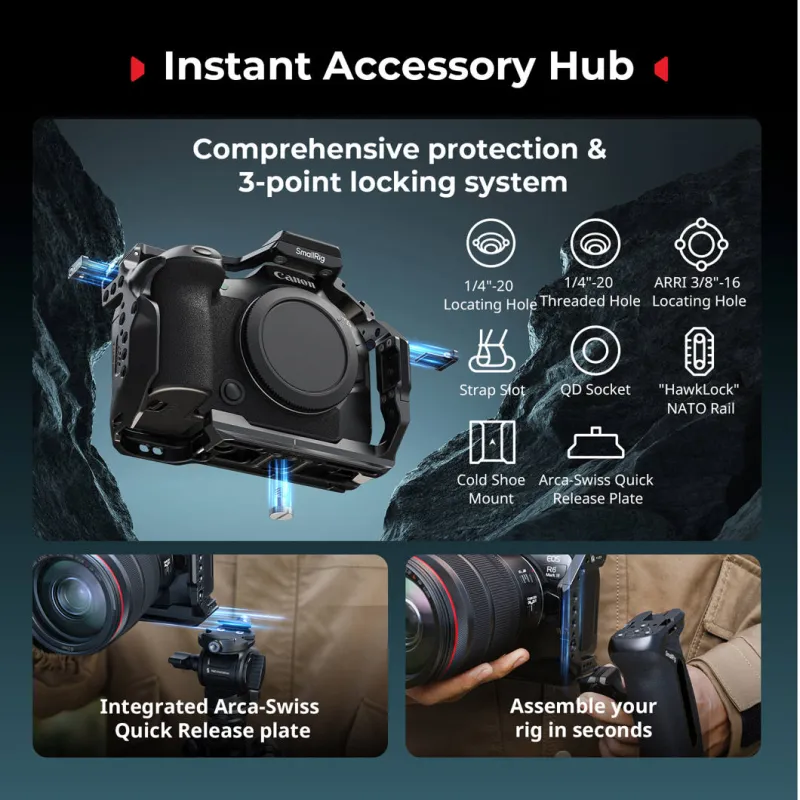 The SmallRig advanced camera cage kit protects Canon EOS R6 Mark III, R6 Mark II, or R5 Mark II while enhancing accessory support.