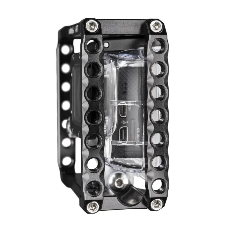 Aptaris not only offers you additional protection for your GoPro, but, with its large number of 1/4 inch threads and the 2 3/8 inch threads, also enables the attachment of accessories on all sides. For exciting perspectives or near ground level filming you can also attach a handle - either from underneath, at the top or at the sides. Aptaris gives you highest flexibility, irrespective of the type of use. Due to the outstanding fitting accuracy you still have unrestricted access to all control elements.