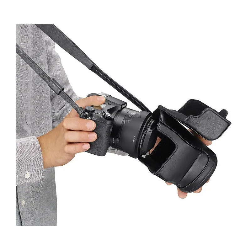 The black LCJ-RXE Premium Jacket Case from Sony accommodates the Cyber-shot DSC-RX10 digital camera, providing a snug fit and safeguarding it against dust and scratches. The rear simply flips up, allowing for quick and easy camera insertion, and is then closed again with buttons. The case also enables access to the camera's 1/4"-20 threaded mount, allowing for connection to a tripod.