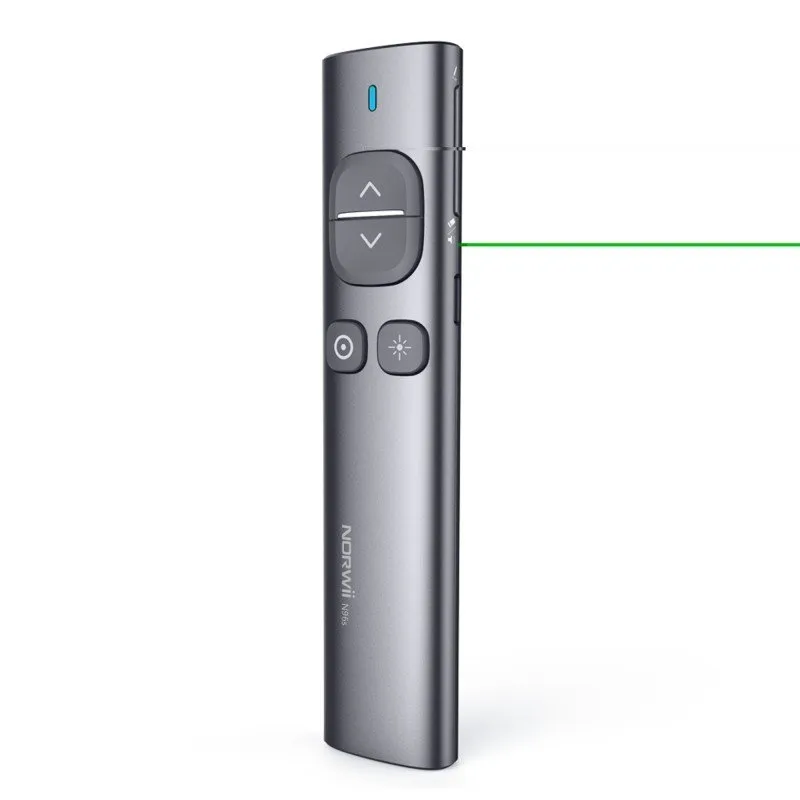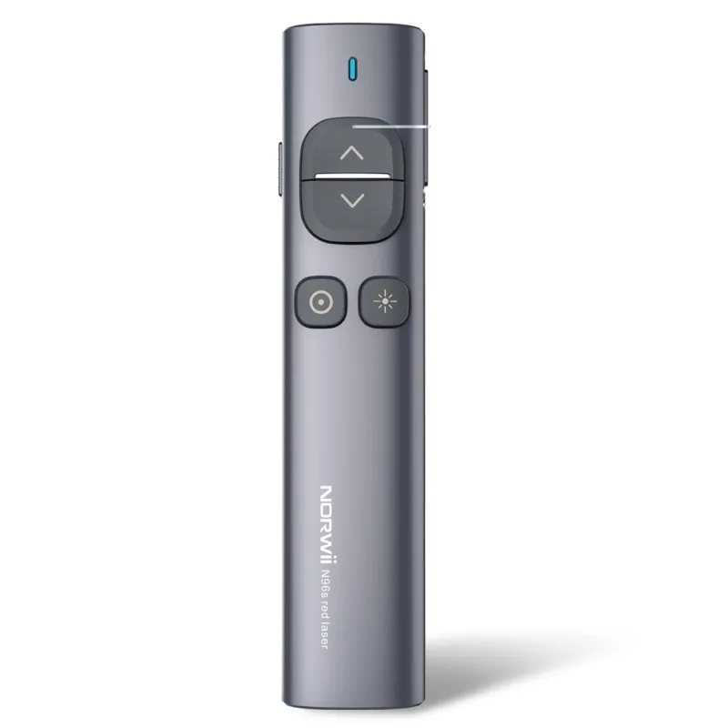 Thus, the Norwii N96s allows you not only to navigate smoothly between slides, but also to move freely throughout your computer workspace. The remote also supports erasing or drawing functions on the screen. You will no longer need a traditional mouse during a speech! 50 meter range The range of the Norwii N96s wireless remote control is an impressive 50 meters. Together with it, you can move freely around the room or auditorium with full control over your presentation. Whether you are conducting a meeting in a small room or on a larger stage, this remote control will enable you to change slides comfortably. Choose the Norwii N96s and enjoy unprecedented freedom when displaying multimedia presentations. Built-in laser pointer The Norwii N96s remote control isn't just about controlling slides. The built-in laser pointer allows you to precisely highlight important elements on the screen. Whether you're giving a motivational lecture, a lesson or a training session, this tool is sure to make your job easier. Use it to highlight key presentation points from up to 200 meters away.