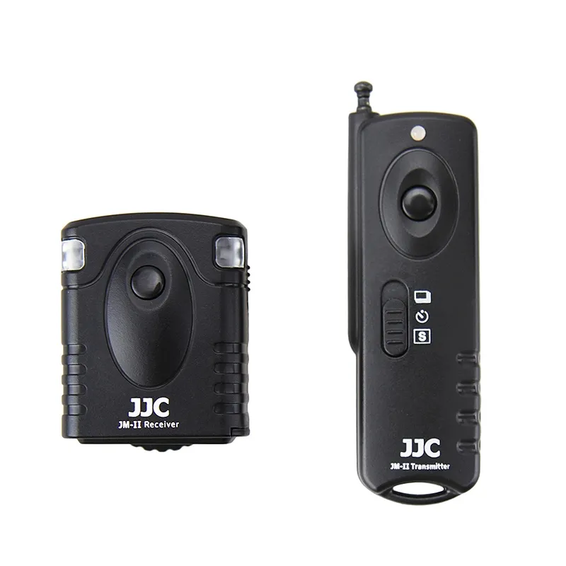 The JJC Wireless Remote Control 30mm JM-A II is a set with a receiver and a transmitter that allows you to control your Nikon camera wirelessly. The system works on a 433MHz frequency and has 16 different available channels. You can trigger the camera from up to 30 metres away without the transmitter and receiver being in sight of each other.