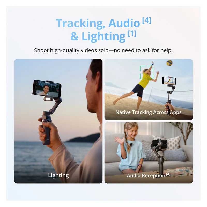 The Osmo Mobile 8 features improved stability over longer distances with the updated ActiveTrack 7.0, which can automatically track body shapes to track human or pet subjects without needing to make a manual selection. Track subjects even after they leave the frame using automatic zooming and gimbal movements for continuous filming.