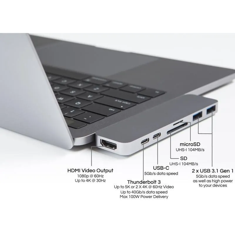 Caruba Duo Hub features HDMI, Thunderbolt 3, USB-C, SD, microSD and two USB 3.0 outputs. The adapter's aluminum housing makes it a perfect match for your MacBook Pro.