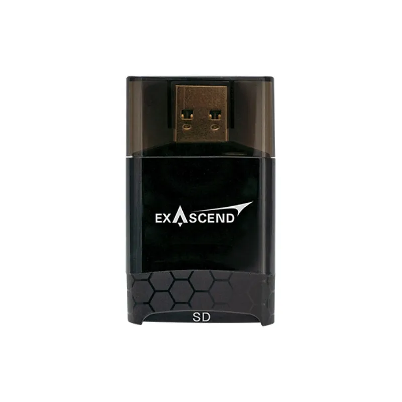 Download content to your computer from both SD and microSD media using the UHS-II SDXC/microSDXC Card Reader from Exascend, which features one UHS-II SDXC slot and one UHS-I microSDXC slot. The slots may be used simultaneously, with the UHS-II SDXC slot supporting transfer speeds of up to 300 MB/s, while the UHS-I microSDXC slot supports transfer speeds of up to 180 MB/s.