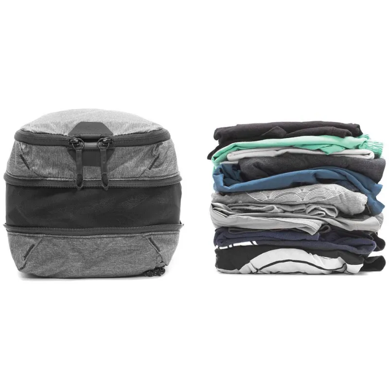 Peak Design Packing Cubes are compressible, easy to access, and instantly dividable, offering unmatched functionality and aesthetics. The unique tear-away zipper allows quick access to contents, unlike standard packing cubes. An internal divider separates clean and dirty clothes, while an expansion/compression zip provides extra space or compresses contents once packed. The outer shell is made of a durable, self-healing 70D nylon/poly blend.