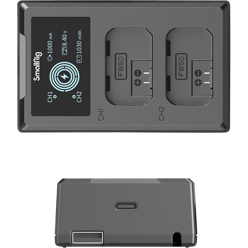 SmallRig NP-FW50 camera battery charger 4081 is made of high-quality ABS+PC fireproof material. The surface is frosted, high temperature resistant, tactile and durable. The built-in battery compartment is the same size as the original camera battery closely fits the camera battery compartment, and is installed without jamming. The charger adopts a double-slot design, which can charge two batteries at the same time. The LCD screen displays the charging voltage, charging current, and charging quantity in real-time, allowing users to see the charging voltage, charging current, and quantity more intuitively. The charger has a built-in USB-A charging line and USB-C input port, which can be charged in any way through the charger, car charger, and mobile power supply.