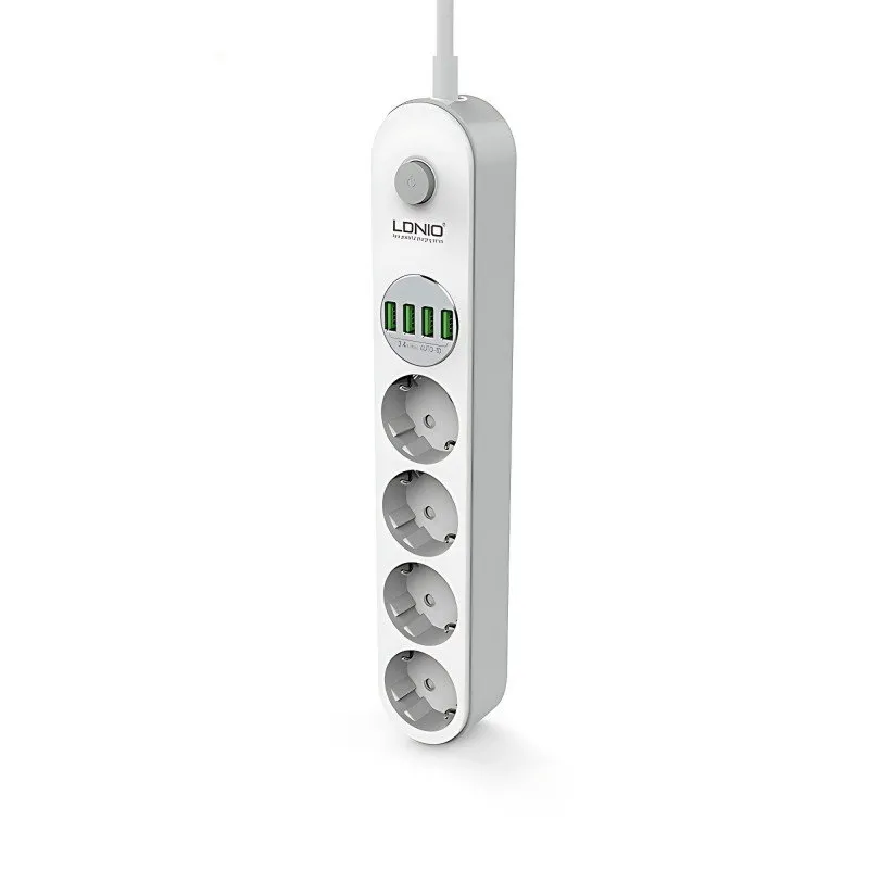 The Ldnio SE4432 is a modern power strip and USB charger in one. With four F-type AC mains sockets and four USB ports, you can power all your everyday electrical devices and charge the batteries in your smartphone, tablet, or smartwatch. The power strip can operate between 100 volts and 250 volts, making it perfect for international travel. No matter what you plug into the extension cord, your equipment will be protected by the device's intelligent systems.