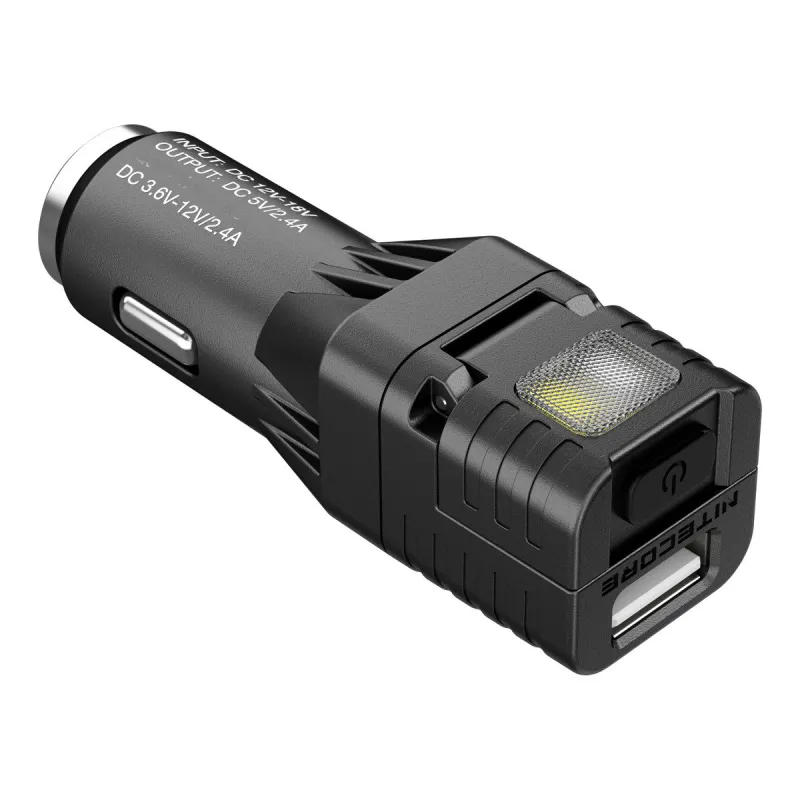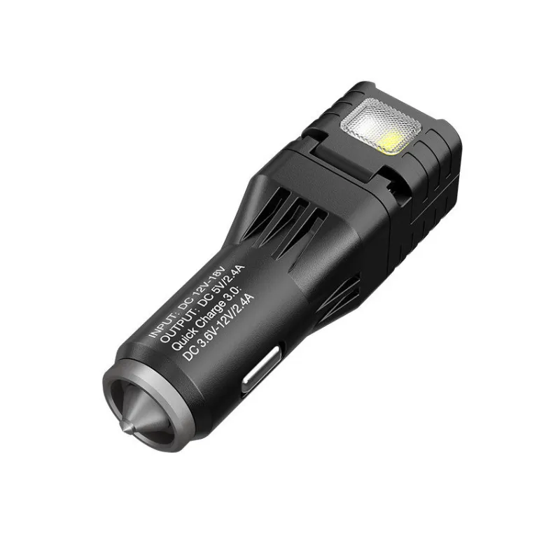 Nitecore VCL10 With the VCL10 car charger, you can easily charge your phone or tablet, have a bright light at your disposal and in case of emergency, simply break your car window. The flashing red emergency light is highly visible. It is a multifunctional USB QC car charger and with the TLC function it ensures a stable output current.
