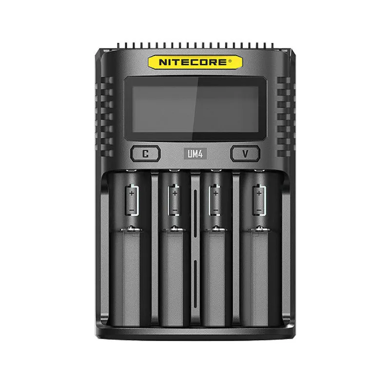 The Nitecore UM4 charger is a universal charger suitable for 4 Li-ion, Ni-MH, Ni-Cd or LiFePO4 batteries. The charger is equipped with a large backlit LCD screen. The screen displays the charging current, charging voltage and charging time per shaft. The charger has a capacity of 1500mA per shaft.