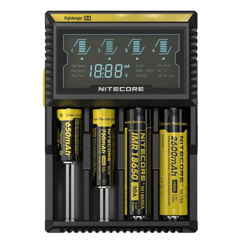 The Nicecore D4 is a universal smart Charger compatible with almost all cylindrical rechargeable batteries, thus eliminating the need to own several chargers. The D4 automatically detect li-ion, NiMH and Ni-Cd batteries and through manual selection is also capable of charging LifePo4 batteries. Intelligent charging circuitry selects the optimal charging mode (CC,CV and dV/dt) for a given battery and each of the D4’s four microcomputer-controlle charging slots then monitors and charges the battery independently. Furthermore, an integradeted digital LCD screen clearly displays charging progress, voltage, current and time while an intelligent automatic power-off function terminates current when charging is complete. The nitecore D4: The world’s most advanced fully-automatic digital charger. It’s as simple as insert, detect and charge