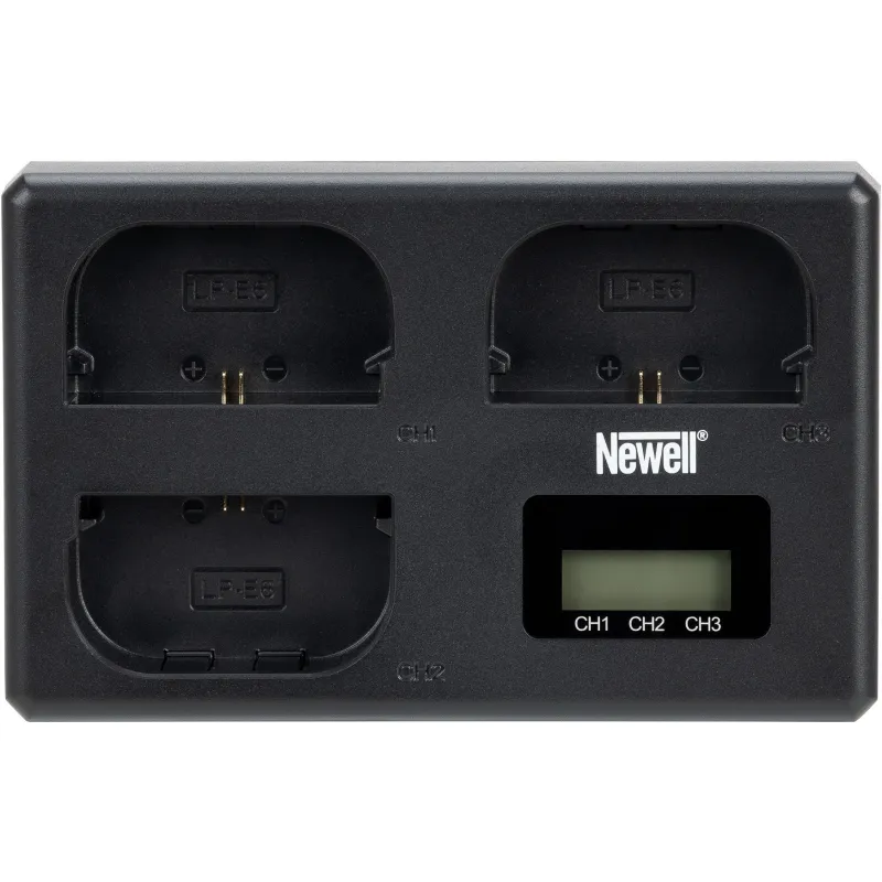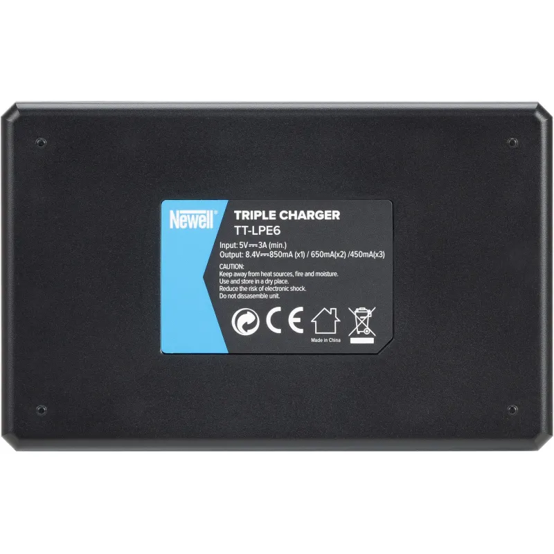 The Newell TT-USB-C is a compact three-channel charger designed for simultaneous charging of three Canon LP-E6 batteries. It features advanced controllers for fast and safe charging, with two ports (USB-C and micro USB) for versatile connectivity.