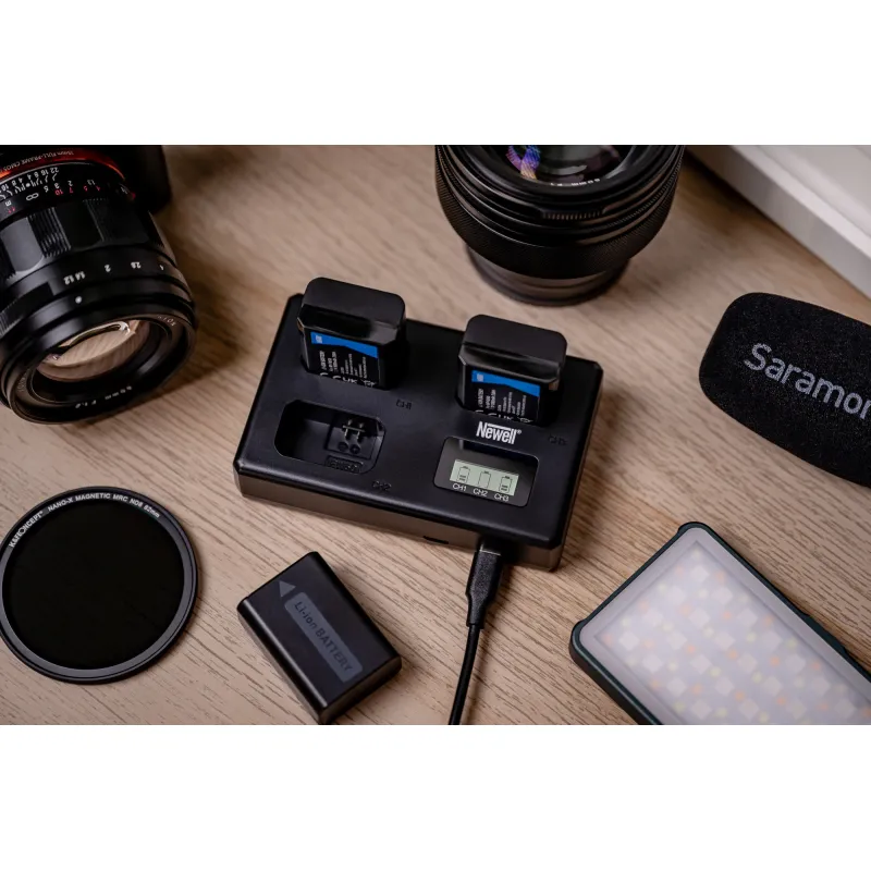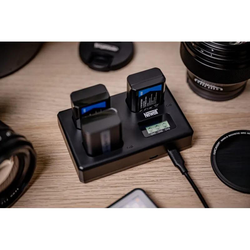 The Newell TT-USB-C is a compact three-channel charger designed for simultaneous charging of three Sony NP-FW50 batteries. It features advanced controllers for fast and safe charging, with two ports (USB-C and micro USB) for versatile connectivity.