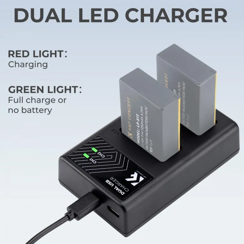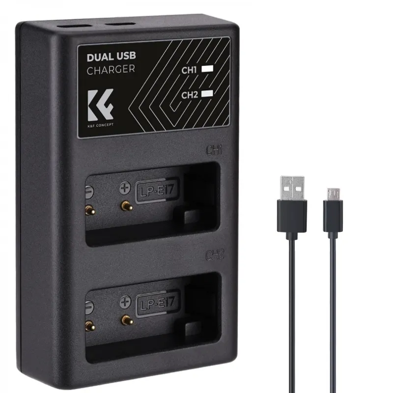 K&F CONCEPT Canon LP-E17 Battery Charger. Type C/Micro USB dual interface charger, easy to carry when traveling, record any wonderful moment, It can charge 1 or 2 LP-E17 batteries. simultaneously.