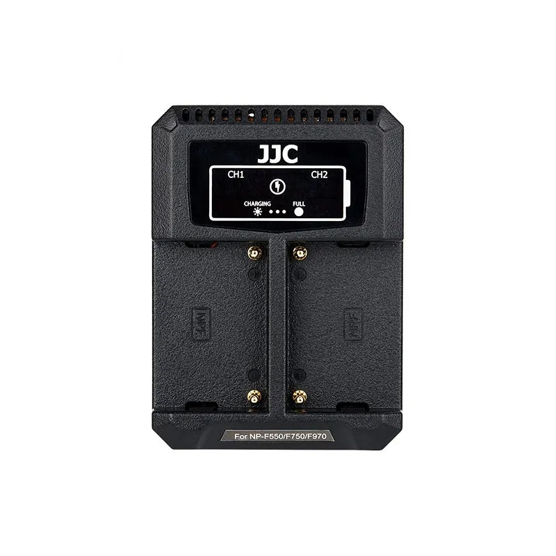 The JJC DCH-NPF USB Dual Battery Charger Allows you to Charge 2 Batteries at the Same Time With A USB Connector or a USB-C Connector. It fits the battery of Sony NP-F550 / F750 / F970 / FM50 / FM500H