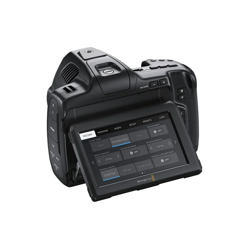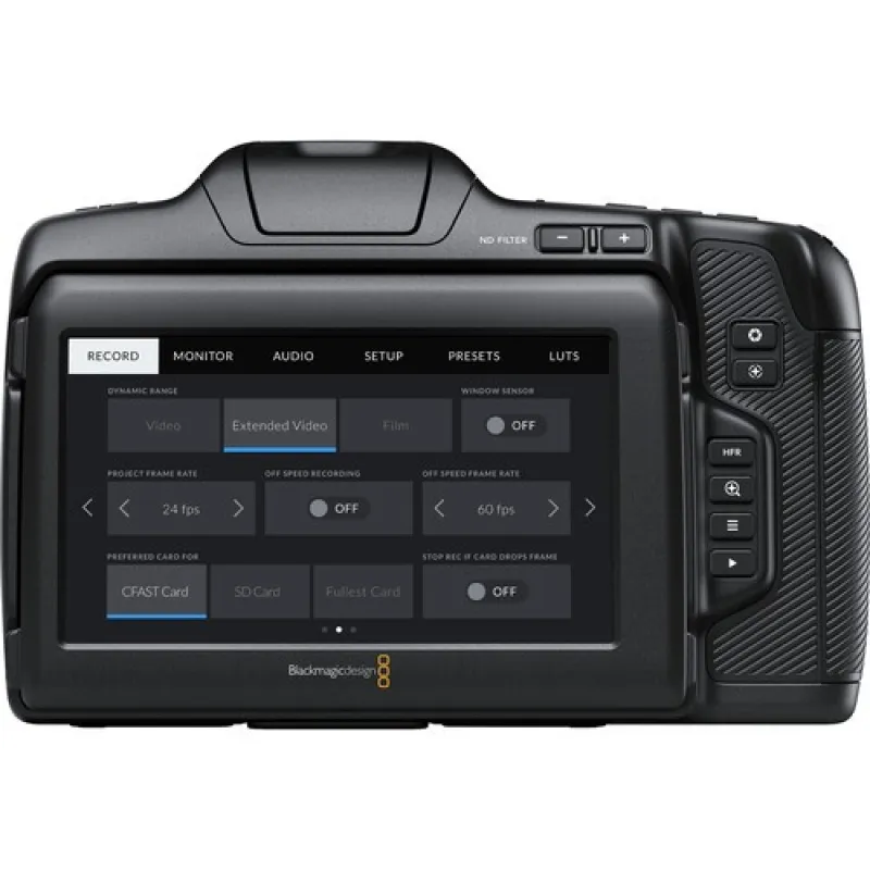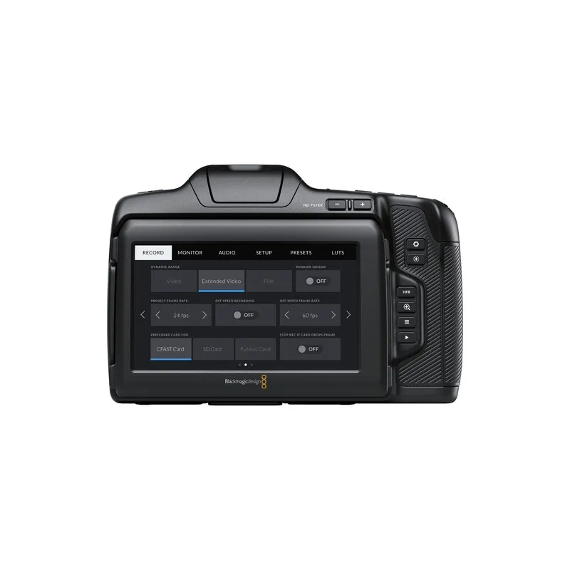 Blackmagic Pocket Cinema Camera features a large, bright 5 inch touchscreen that makes it easy for customers to frame shots and accurately focus. On screen overlays show status and record parameters, histogram, focus peaking indicators, levels, frame guides and more. The Pocket Cinema Camera 6K Pro LCD monitor is a more advanced HDR display that can be tilted up and down so it's easy to monitor their shot from any position. Plus the 6K Pro model’s HDR display features 1500 nits of brightness, ideal for use in bright sunlight.