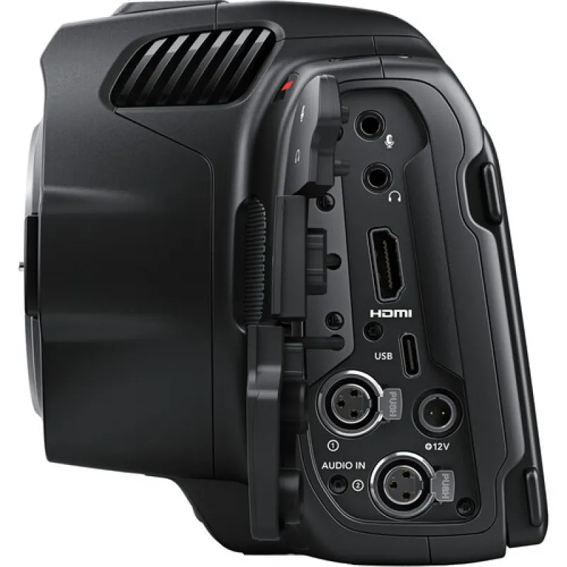 Blackmagic Pocket Cinema Cameras feature a mini XLR input with 48 volts of phantom power for connecting professional microphones such as lapel mics and booms. The 6K Pro model features 2 mini XLR connections, allowing customers to record 2 separate audio tracks using 2 mics, without an external mixer. The four built in mics have an extremely low noise floor and are shock and wind resistant, capturing great sound in any location. There’s also a 3.5mm audio input for connecting video camera microphones, along with a built in speaker for playback and a 3.5mm headphone jack.