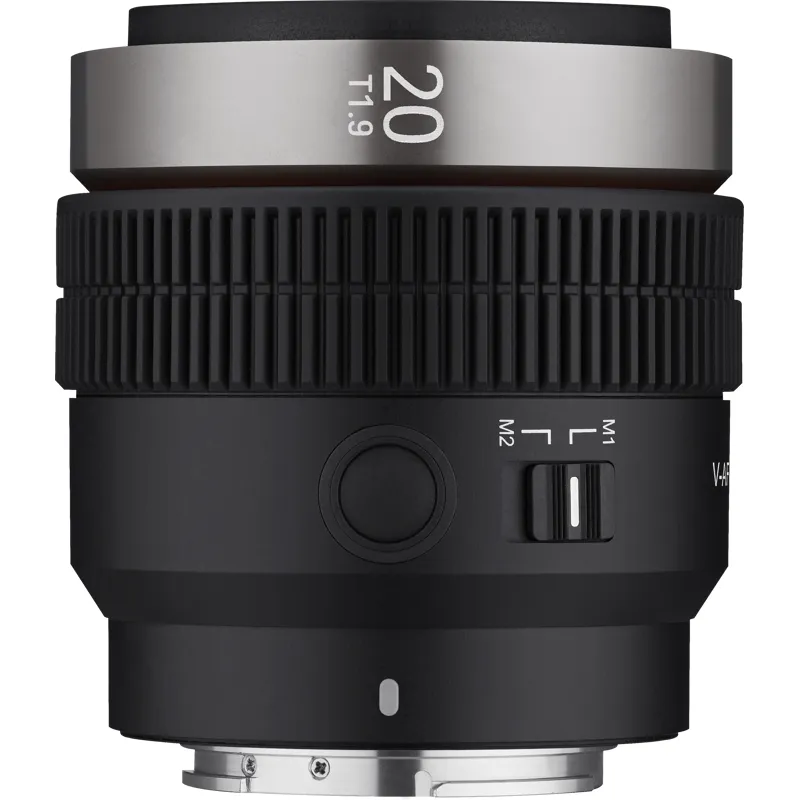 The tally lamp indicates recording status, a feature popular among YouTubers. A customizable dial on the side allows for manual focus or aperture adjustment, with a focus hold button for locking focus. The V-AF 20mm T1.9 boasts advanced construction for a cinematic look.