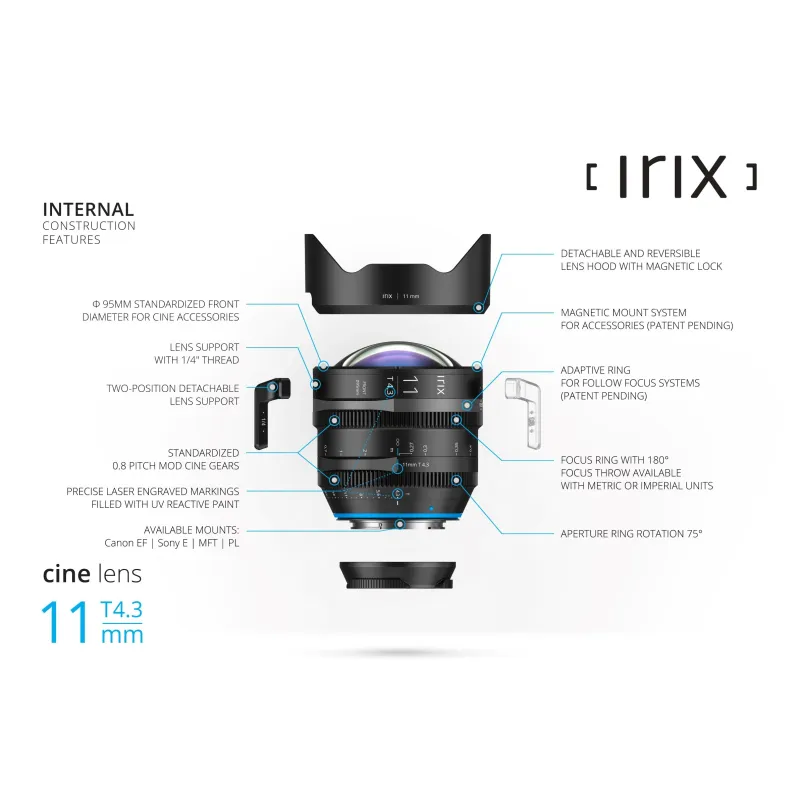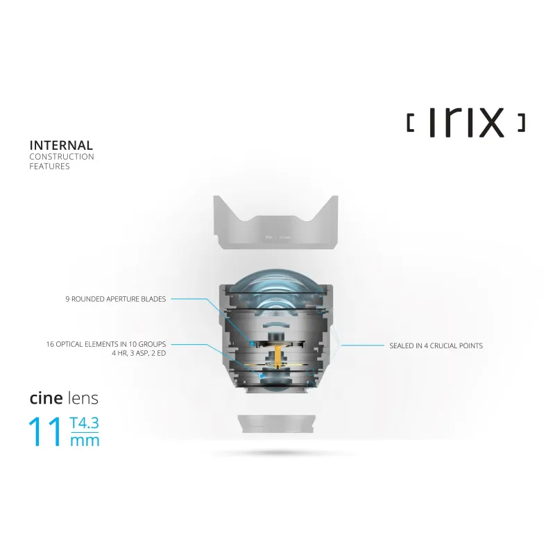 The Irix Cine 11mm T4.3 is the full frame cine lens, ready for capture image with 8K UHD resolution. Its extremely short focal length, rectilinear image projection and the large image circle of 43.3mm (covering the full frame format) make it one of the most outstanding cine lenses on the market. Depending on the diagonal of the sensor, the lens can provide a moderate wide angle of view for classic wide-angle shots or super-panoramic 123 degree viewing angle in a 2.39:1 widescreen format. The lens optical system is based on the new optical formula, developed especially for cinematic purpose. It consists of 16 optical elements, which four are made with high refractive index (HR) glass, three other have aspherical surfaces and last two are made with low-dispersion glass (ED). The use of large front lens and other special glass elements provides crisp cinematic shots in a resolution up to 8K while keeping the focus "breathing" effect at the lowest level. When designing the lens mechanical system of 11mm T4.3, we used newly developed technical solutions that have been successfully implemented in the Irix Cine 150mm T3.0 lens. The new Multi Start Thread focusing mechanism allows quiet and precise focusing even under adverse weather conditions such as rain, humidity or extreme temperatures. The focusing geared ring rotates 180 degrees and depending on the lens version, has focusing scale with metric or imperial units. Thanks to the another innovative solution like adaptive ring, the Irix Cine 11mm T4.3 ensures great ergonomics of operation both by hand and with follow focus mechanism. Moreover, despite of the very short optical system layout, geared rings of focus and aperture were placed at the same height as in other Irix Cine lenses - all for better ergonomics and more intuitive use. The exceptional functionality and innovative solutions are a distinctive feature of all Irix products. The same applies to the Irix Cine 11mm T4.3, whose extremely compact design (weights 1,1 kg) has been also equipped with an innovative Magnetic Mount System for accessories. The MMS system allows quick and easy attachment of variety dedicated accessories. The lens hood included in the kit with the lens is the first element of the MMS system. The system will be expanded with further accessories. The Irix Cine 11mm T4.3 key features: full frame sensor coverage with 43.3 mm image circle, Ultra HD 8K ready optics, Extremely short focal length of 11mm, Super-panoramic 123 degree viewing angle in a 2.39:1 widescreen format, Very compact size and low weight, Ultra-low focus breathing effect, Weather-sealed construction, Standardized front accessory diameter 95mm, Magnetic Mount System for Irix Cine accessories, Detachable lens hood with magnetic mount, Compatibility with various follow-focus system IMAGE SIZE - 35mm "Full Frame" FOCAL LENGHT - 11 mm FIELD OF VIEW - 123° in a 2.39:1 widescreen format FOCUSING RANGE - 0,27 m (10.63”) - ∞ FOCUSING TYPE - manual FOCUS RING ROTATION ANGLE - 180° APERTURE RANGE - T4.3 ~ T22 FRONT FILTER THREAD - no REAR FILTER THREAD - no BAYONET MOUNT - Sony E DIMENSION - 131 x 95 mm WEIGHT - 1170 g (2.58 lbs) DIAMETER OF FRONT HEAD - 95 mm