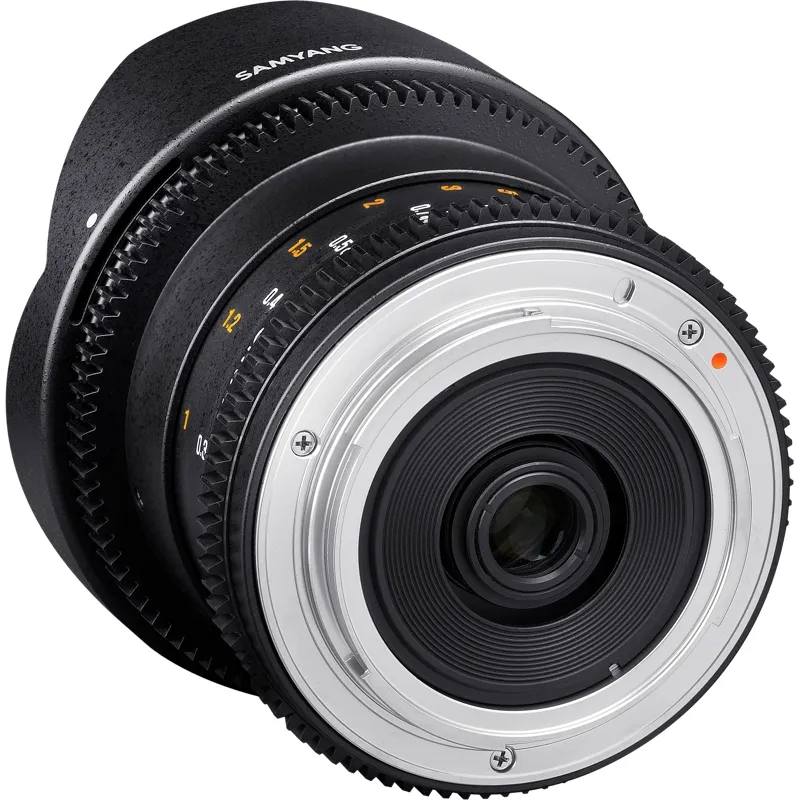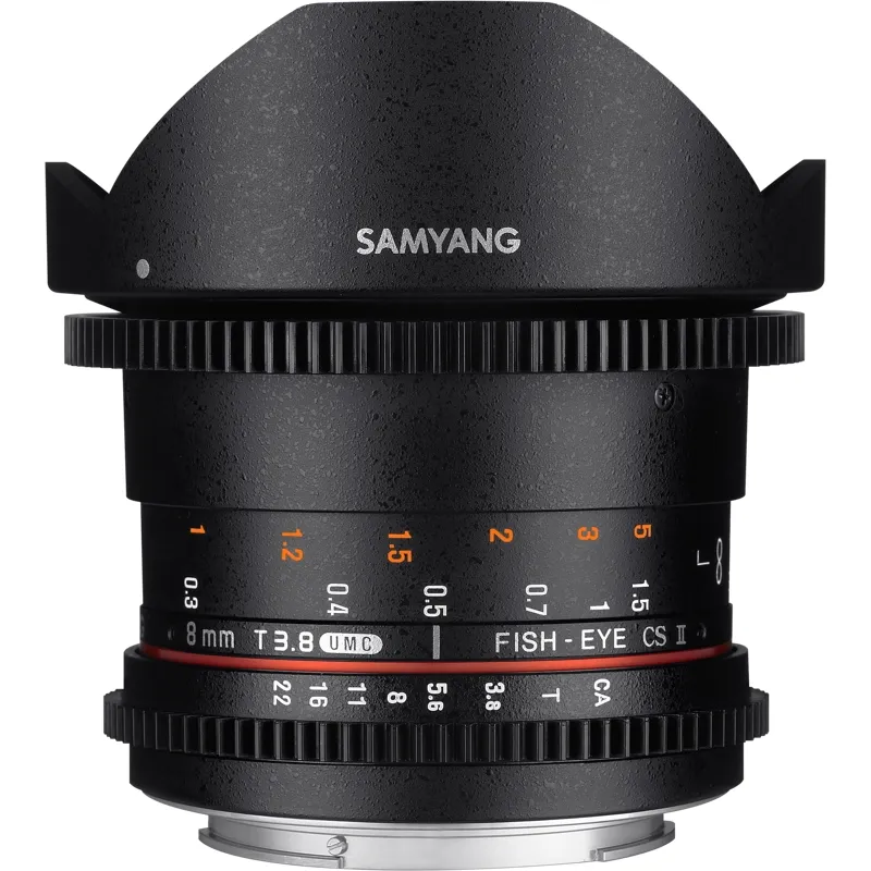 Samyang 8mm T3.8 Fisheye CS is specially developed for filming with a focus following system. It is compatible with SLR cameras with APS-C image sensor and has a removable hood.