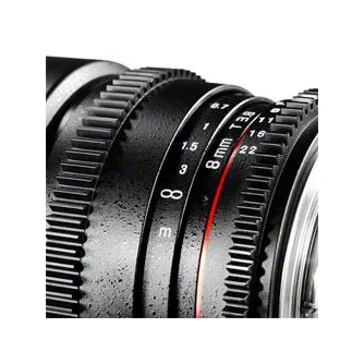 This Fisheye by walimex pro was developed for videography and photography. The f-stop can be adjusted steplessly from 3.8 to 22 and the focus is adjusted softly and runs smoothly. That way a tracking of the focus when filming is possible. The aperture ring and the focus ring come with a tooth ring and are therefore optimized for use with follow focus systems. For better readability, the distance and f-stop scale are displayed sideways.