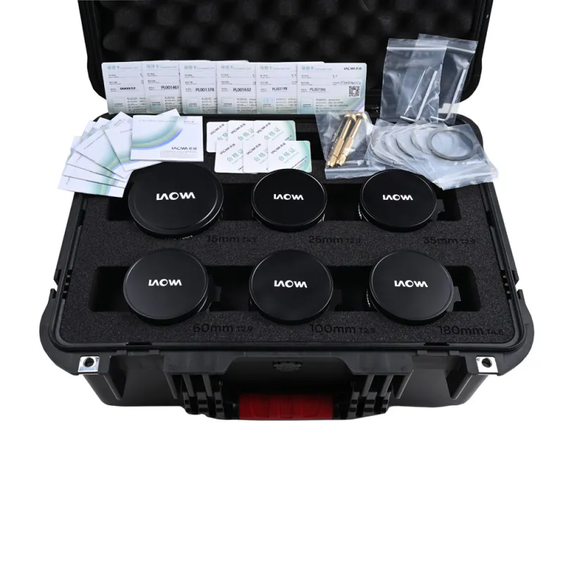 The Laowa Sword Cine 6 Lens Bundle (15mm, 25mm, 35mm, 60mm, 100mm, 180mm) Arri PL is a set of six full frame macro cine lenses with focal lengths of 15mm, 25mm, 35mm, 60mm, 100mm, and 180mm designed for use with ARRI PL mount cameras.