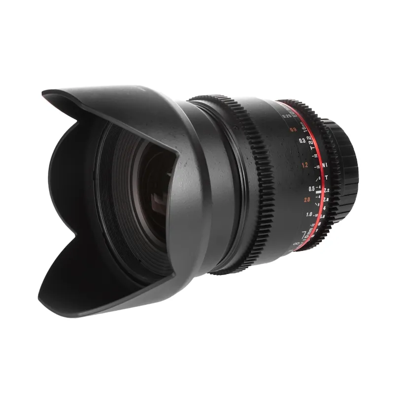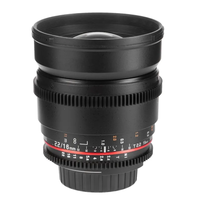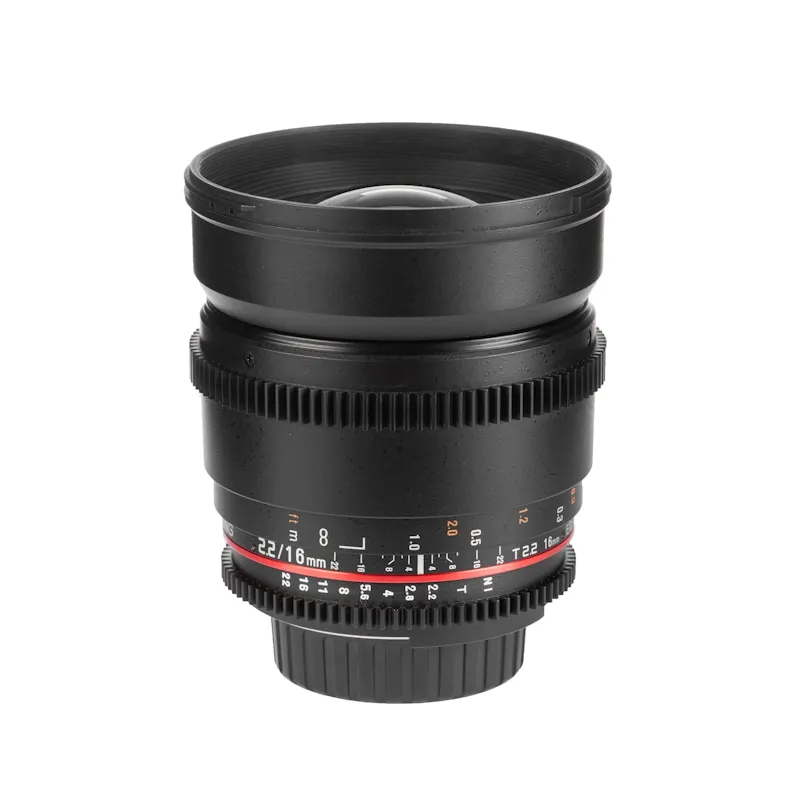 The Samyang 16mm VDSLR is a bright wide -corner lens for cameras with a DX sensor. The lens is made up of 13 elements that are grouped in 11 groups. The lens has an aspherical glass area, which makes the lens lighter and more compact and ensures less chromatic aberration. The high quality multi-layer coatings give contrast and colorful images. The cinema version has a toothed focus and stepless aperture for attaching a follow focus. The aperture values and the focus scale are positioned on the side of the lens.