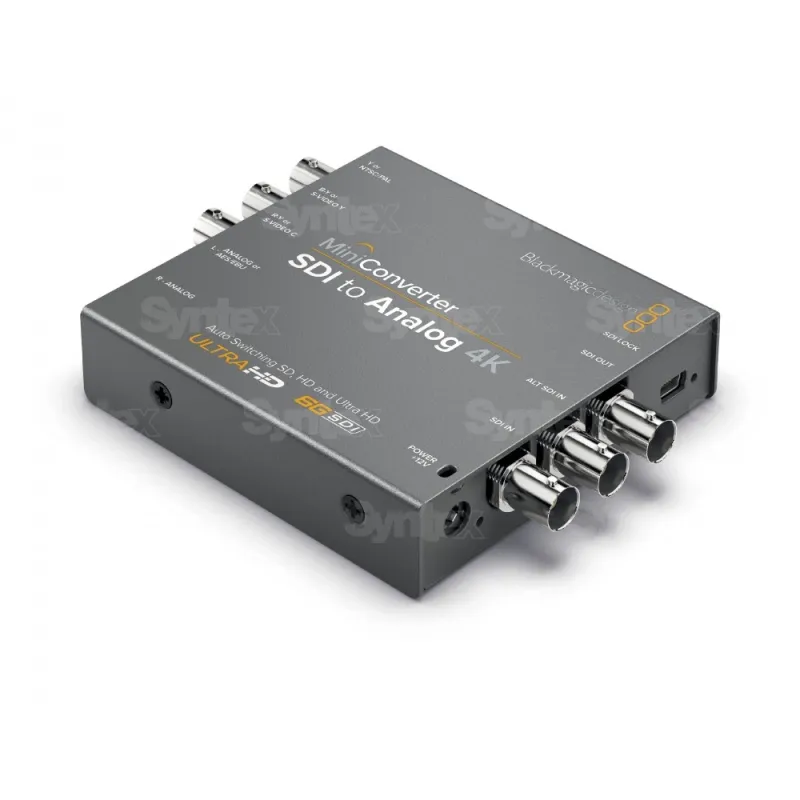 Mini Converter SDI to Analog 4K converts from SDI to analog component, S-Video or composite. Includes SD/HD auto switching, redundant SDI input, down conversion, plus analog or AES/EBU audio outputs de embedded from the SDI video input. This model will automatically down convert an Ultra HD SDI input when detected to regular HD on the component outputs or standard definition when s-video or composite is output.