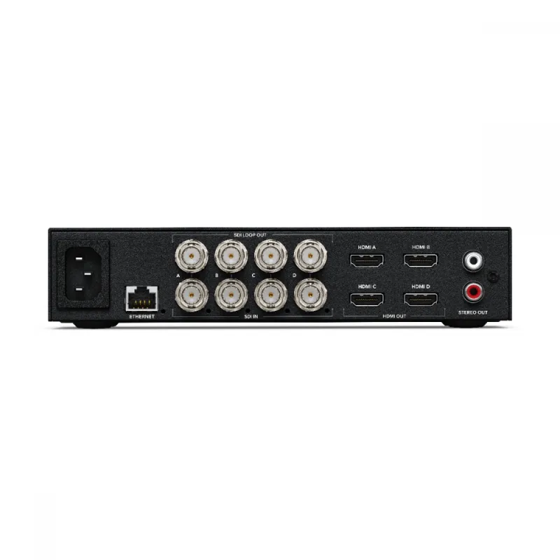 The innovative design is much better than regular converters as you can rack mount the converter if needed. The front panel feels elegant when placed on a desktop plus it includes buttons and a color display for video monitoring with audio meters and video standard. The rear panel has Quad Link 12G‑SDI for HD, Ultra HD as well as 8K formats. There are also 4 HDMI outputs allowing use with 8K televisions that feature quad HMDI inputs, plus a down converter for using 8K sources on Ultra HD or HD televisions. You can even convert between 2SI and Square Division all automatically! There's also AC power, analog audio HiFi out and a front panel USB connection for use with monitor calibration probes.