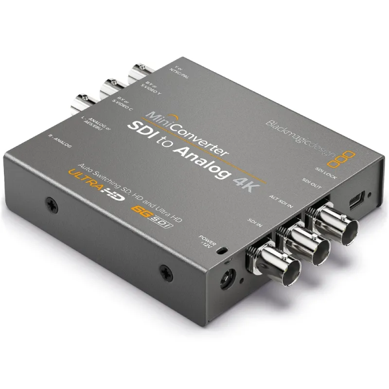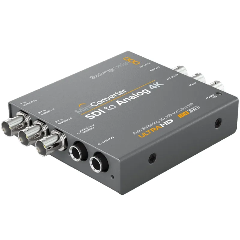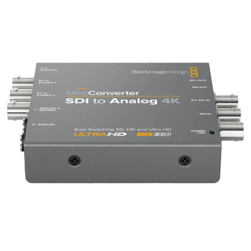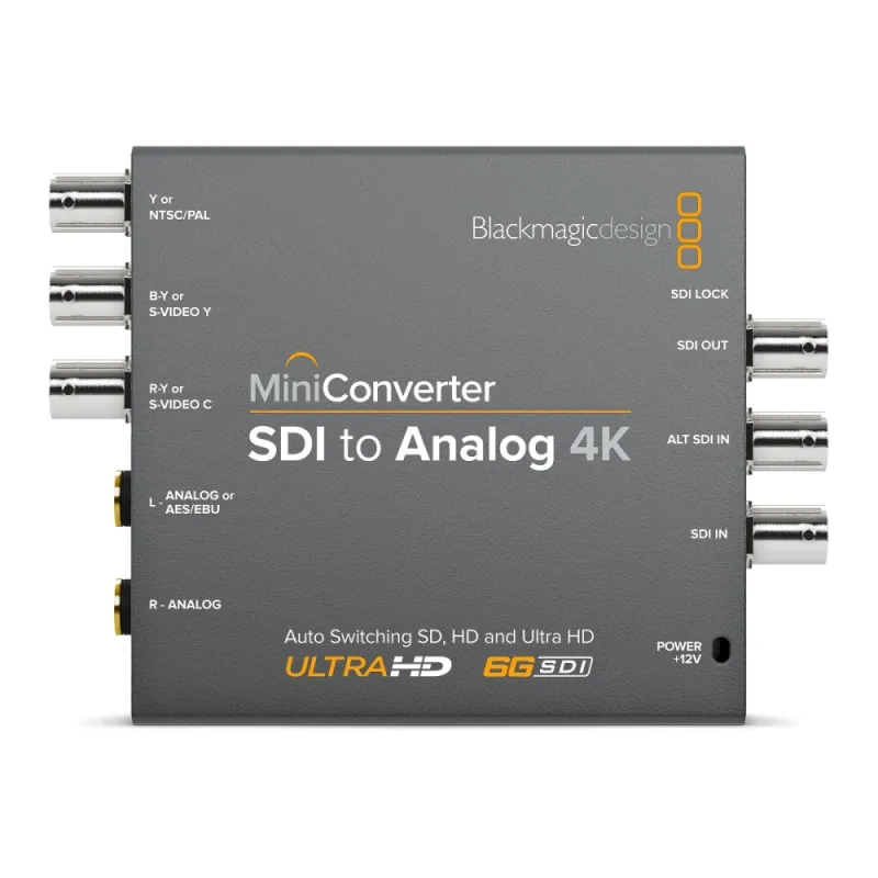 Mini Converter SDI to Analog 4K includes everything you need to convert from SD, HD, 3G and 6G-SDI video to analog in HD/SD component, NTSC and PAL video. The built in down converter means you can even connect Ultra HD sources to component video in SD or HD as well as NTSC and PAL video! Easily connect any analog equipment such as Betacam SP, VHS, and video monitors!