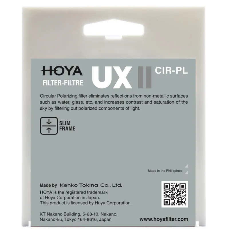 The UX II CIR-PL filter can be used with both film and digital cameras. The polarizing filter structure incorporates a polarizing film between the two glasses, and the front frame is designed to be rotated, thus positioning the polarizing film at the desired angle.