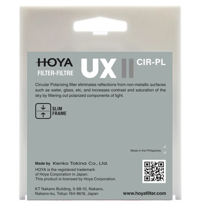 The UX II CIR-PL filter can be used with both film and digital cameras. The polarizing filter structure incorporates a polarizing film between the two glasses, and the front frame is designed to be rotated, thus positioning the polarizing film at the desired angle.