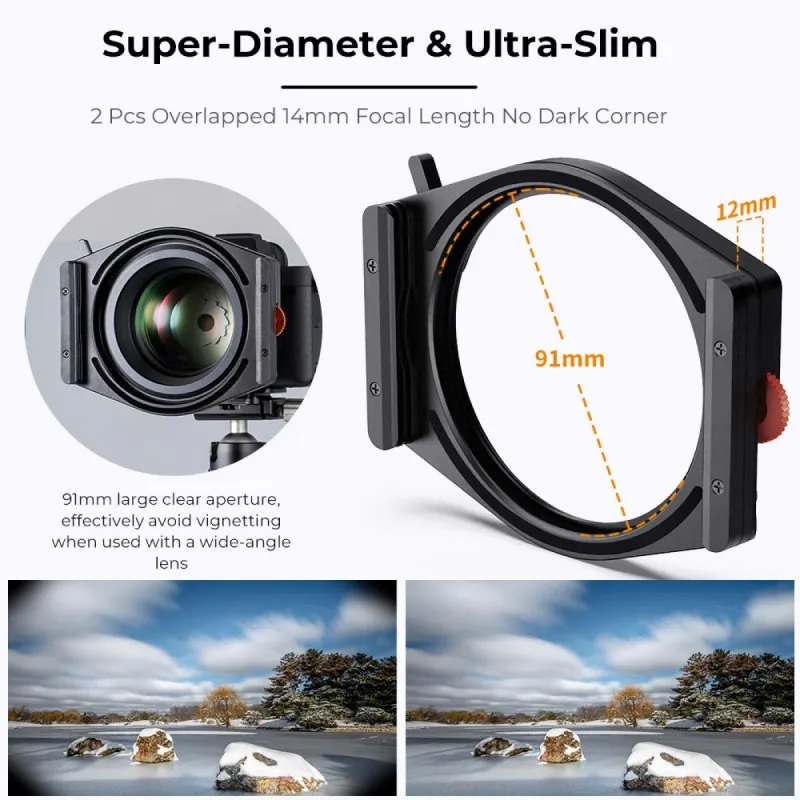 Super diameter ultra-slim: holder thickness 12mm, 91mm large clear aperture. Effectively reduce the likelihood of vignetting when using an ultra-wide angle lens. Easy to remove, no light leak: two square filters can be stacked in one holder, and the CPL will be lifted when the filter holder cover is lifted.