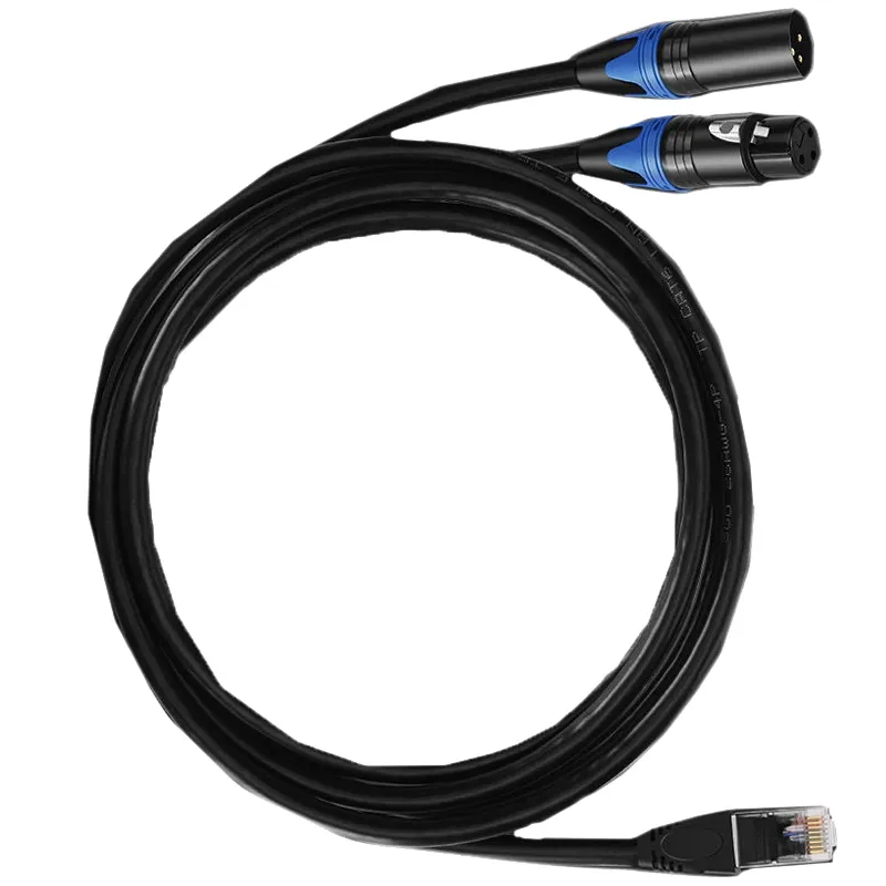 The Hollyland Ethernet to Dual XLR Cable is a 6.6' utility cable designed for cascading Hollyland intercom systems in expanded configurations. Use it to interconnect two compatible systems, such as the Syscom 1000T with the Solidcom M1 or Mars T1000. It features an RJ45 male connector on one end and two XLR connectors (one male and one female) on the other end.