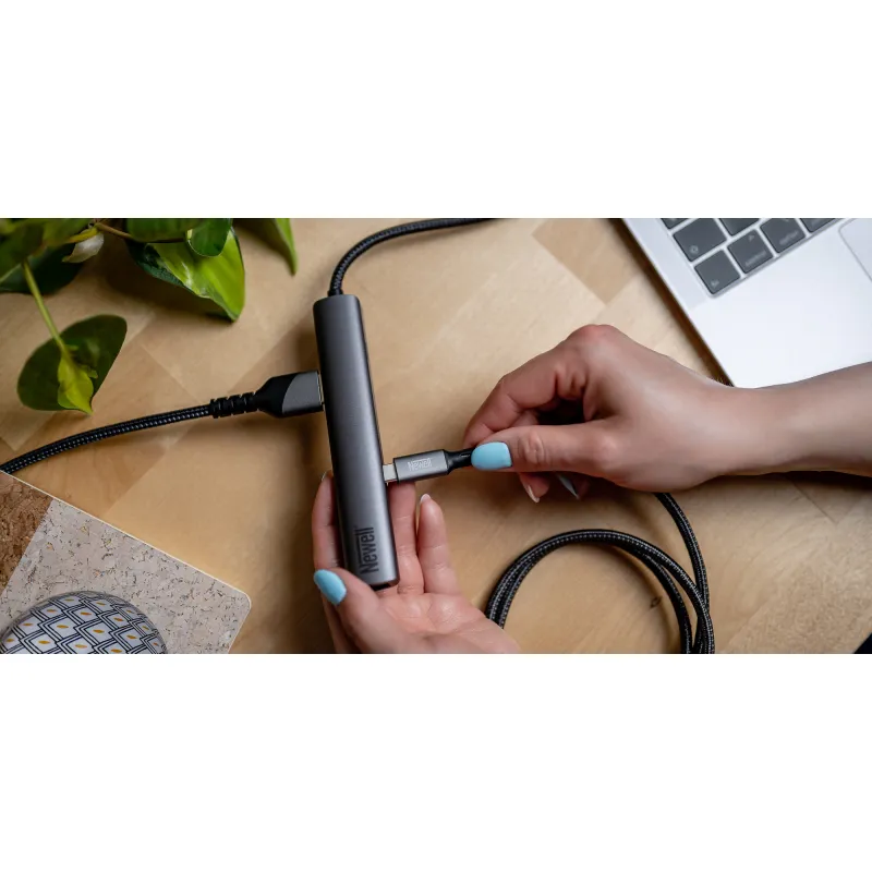 Newell 6-in-1 Hub is a universal splitter that connects to the USB-C connector. The small device, distinguished by its stylish oblong design, will effectively extend the functionality of your computer or tablet. The hub offers: 2 USB 3.0 ports, 2 USB-C ports (including one supporting 100W Power Delivery fast charging technology), an HDMI port (4K 60 Hz) and an RJ45 socket. The maximum data transfer rate here is 5 Gbps. The RJ45 socket allows you to connect a network cable and use data transmission up to 1 Gbps. The aluminum housing guarantees ultralightness and effective protection from damage. This hub is an ideal choice when you need access to more ports, or when your device has a USB-C input, but lacks USB Type-A inputs, as well as an HDMI port and RJ45 jack.