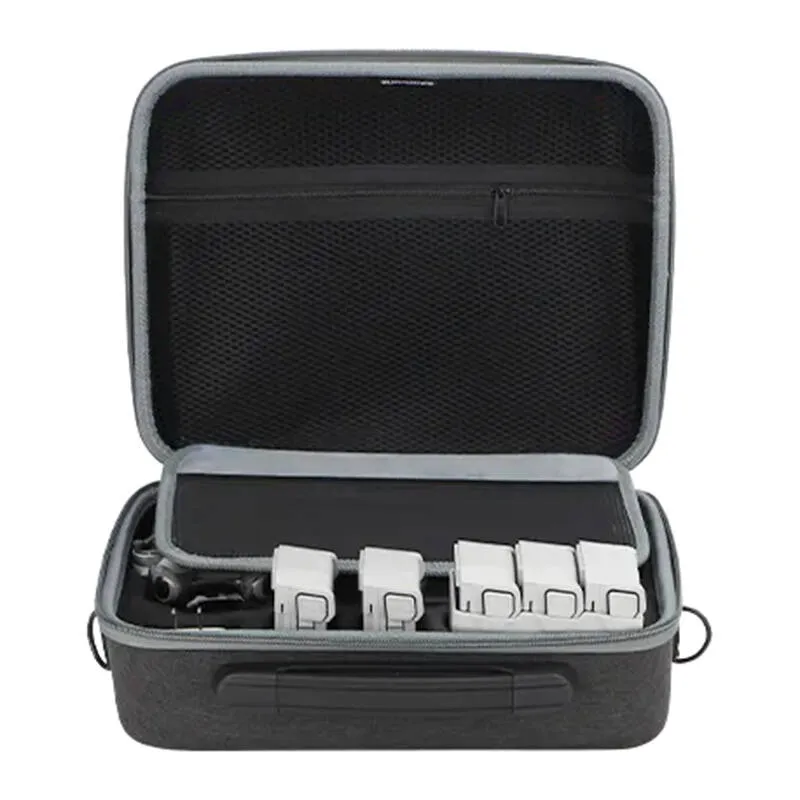 The upper and lower parts of the case are separated by a wall covered with soft material, which prevents accessories stored in the upper part from scratching the drone or controller. The pocket is sewn with a mesh that allows the user to get a sneak peek of the contents, so they can quickly assess whether theyve packed everything they need. The pocket is zippered to ensure that nothing falls out of it.