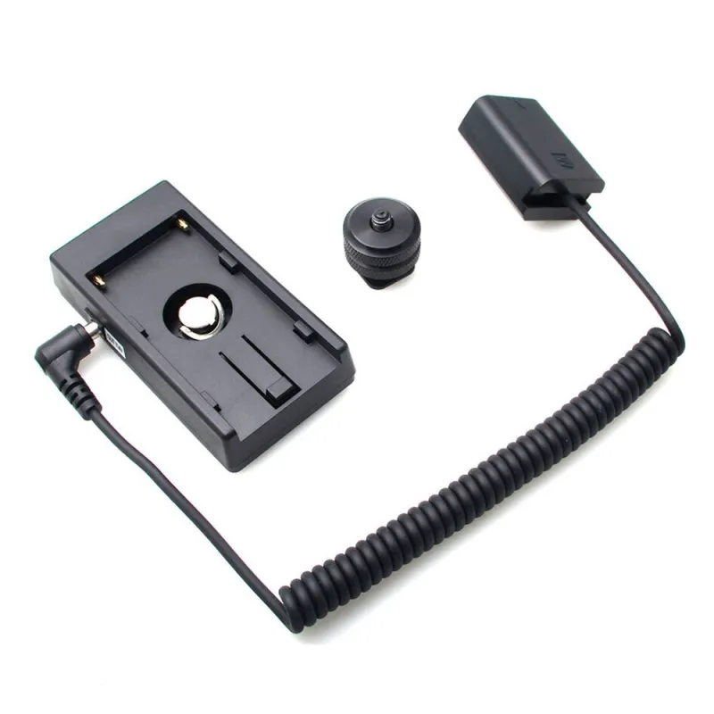 The Caruba Sony NP-FW50 Full Decoding Dummy Battery is provided with a NP-F serie battery plate that can be mounted to the bottom of the camera or a rig. Or mount it to the hot shoe of the camera through the included cold shoe adapter. The cable has a length of 35-120cm