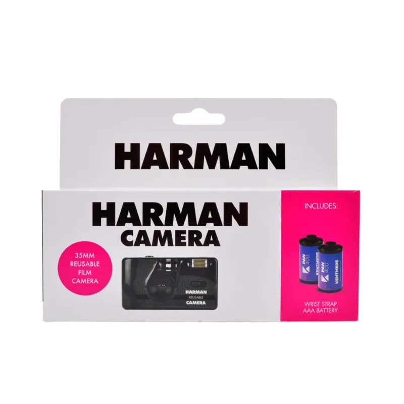 Film photography in its most simple form, this Reusable 35mm Film Camera from HARMAN technology is a basic and accessible film camera for general use. Resembling a disposable camera, this plastic camera has the added benefits of a reusable design, including a film rewinding mechanism and latched door, and the built-in flash is powered by a replaceable, included AAA battery.
