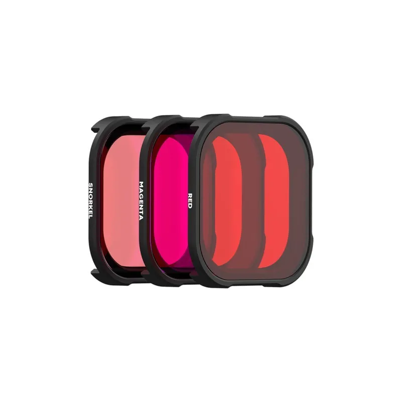 A set of 3 filters designed for underwater use with GoPro Hero 9/10/11/12 cameras. These filters are compatible with waterproof cases and enhance color saturation underwater.