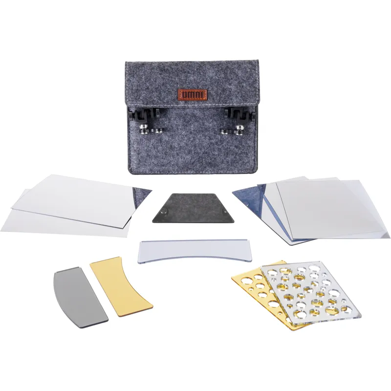 This expansion kit enhances the versatility of the OMNI filter system, allowing for endlessly configurable effects. It includes 11 inserts, ranging from Swiss cheese gold and silver mirrors to cuttable partial and fully reflective sheets. Shape and deform reflections to your desired form and size, unlocking limitless possibilities.