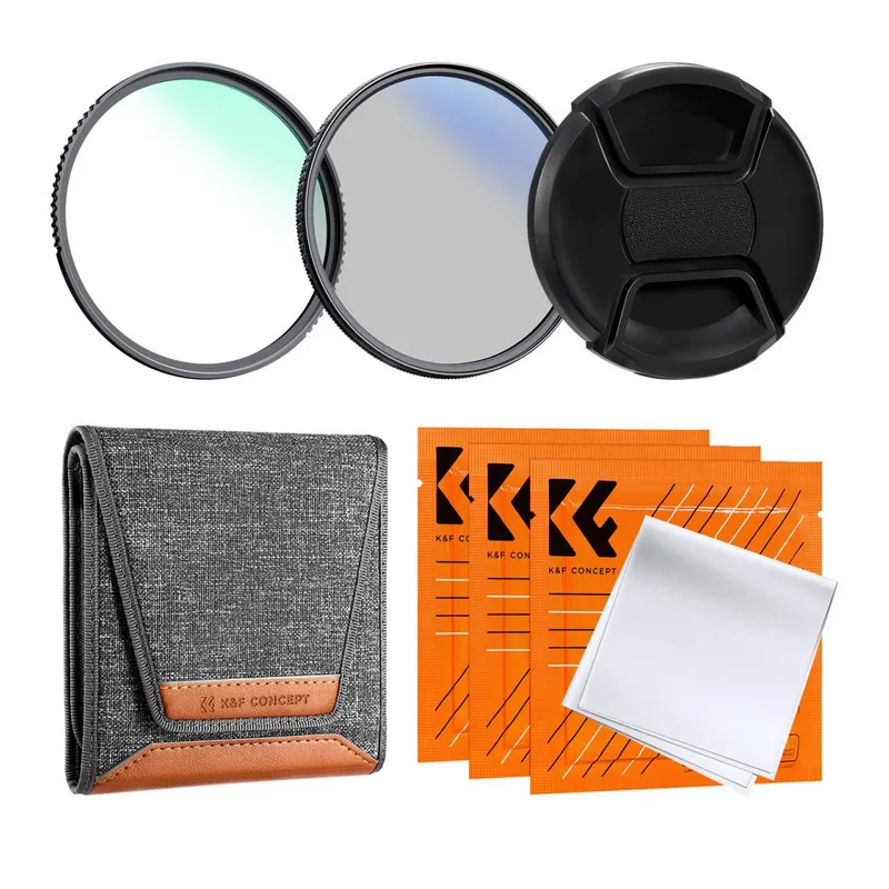 The K&F 58mm 2pcs Professional Lens Filter Kit is an ideal choice for photography enthusiasts seeking quality and versatility. This kit includes a UV filter and a polarizing filter, crafted from premium Japanese optical glass with 18 layers of advanced coating to enhance image clarity and minimize reflections. The UV filter protects your lens from scratches and UV light interference, improving overall image quality by reducing blue tint and enhancing color accuracy. The polarizing filter helps to eliminate strong reflections from non-metallic surfaces, increasing color saturation and reducing light spots. Additionally, the kit comes with a snap-on lens cap for protection against scratches and dust, as well as three cleaning cloths and a filter pouch for easy storage and maintenance.