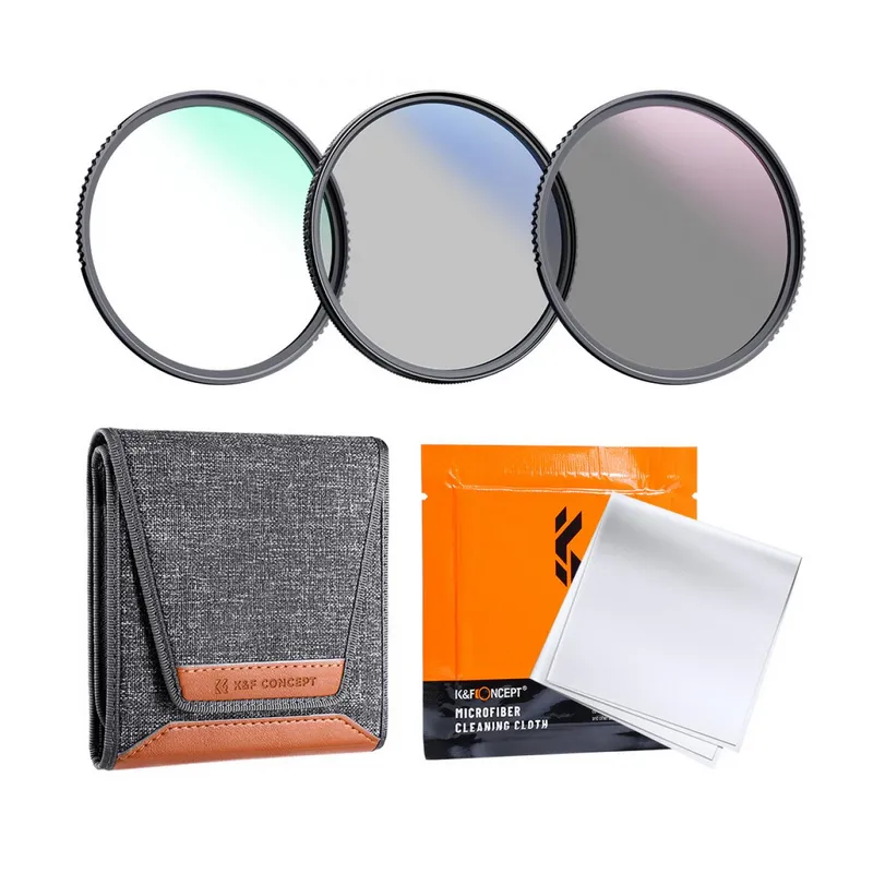 The K&F 58mm Professional Lens Filter Kit includes a UV filter, CPL polarizer filter, and ND4 neutral density filter, along with a filter pouch and three cleaning cloths. This kit is perfect for various shooting scenarios, enhancing colors, reducing glare, and managing exposure.
