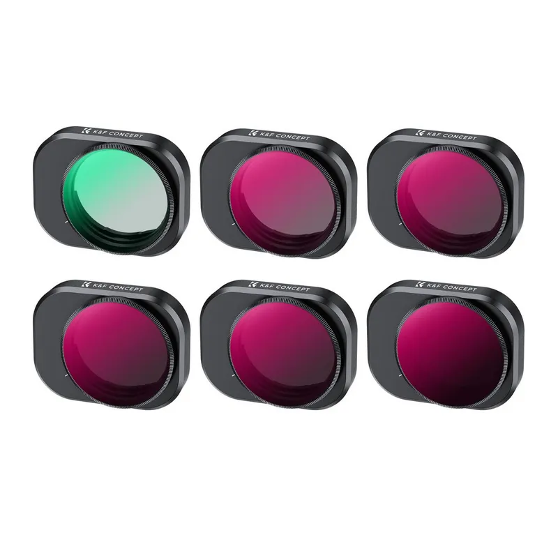 The K&F 6pcs Filter Kit for DJI Mini 4 Pro includes CPL, ND4&PL, ND8&PL, ND16&PL, ND32&PL, and ND64&PL filters, providing comprehensive light control and enhancing image quality. Made from top AGC optical glass with 28 layers of nano-coatings, these filters offer robust protection and high-definition clarity. The kit combines ND and CPL functionalities to reduce glare, manage light, and enhance color saturation and contrast without affecting gimbal calibration and balance.