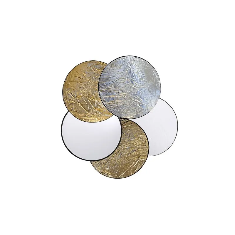 The Falcon Eyes CRK-22 SLG 5 in 1 Reflector is a standard diffuse reflector supplied with a removable cover. This removable, zip up cover is reversible and equipped with 4 different colours: white, gold, silver and sunny gold. The reflector has a diameter of 56cm and can be folded and packed away in the supplied carry bag.
