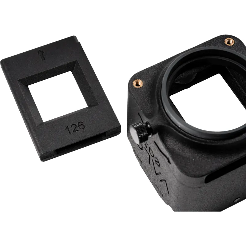 The Easy35 126 holder allows you to scan 126 films that are 35 mm wide and have a frame size of 26.5x26.5 mm or smaller. The holder features an asymmetrical design, which shows more of one side of the frame than the other, similar to how the 126 frame is offset on the film. This holder is part of the easy35 system, just like any other compatible holdersimply remove the existing holder and insert this new one.