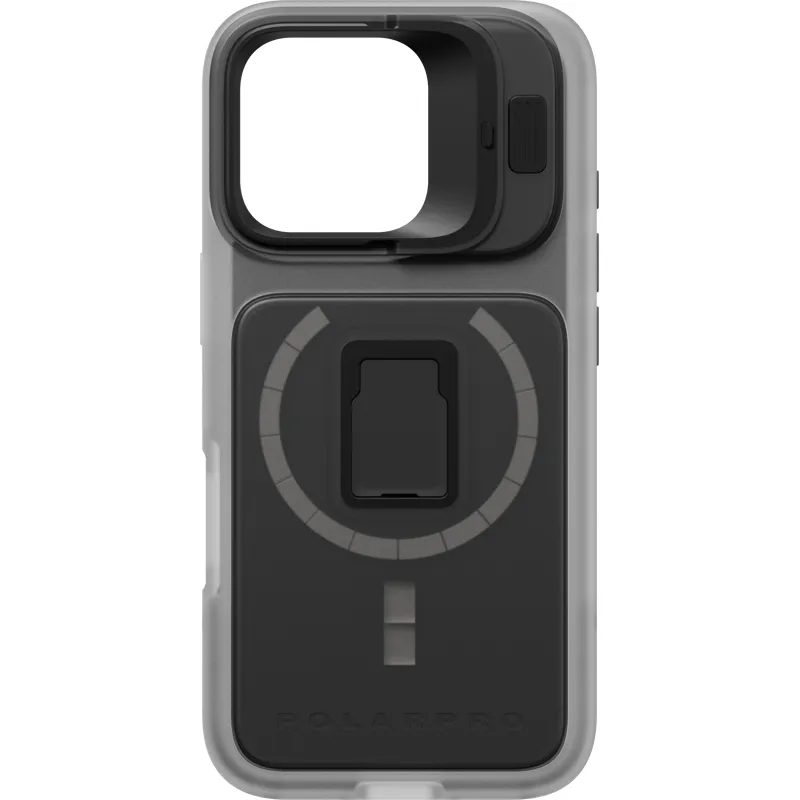 It includes an aluminum cold shoe mount on the back, providing a stable attachment point for the iPhone 16. The new Flip-Down lens protector allows for quick shots without removing the lens. Additionally, the MagSafe array has been made twice as thick and durable for a secure connection with vehicle mounts.