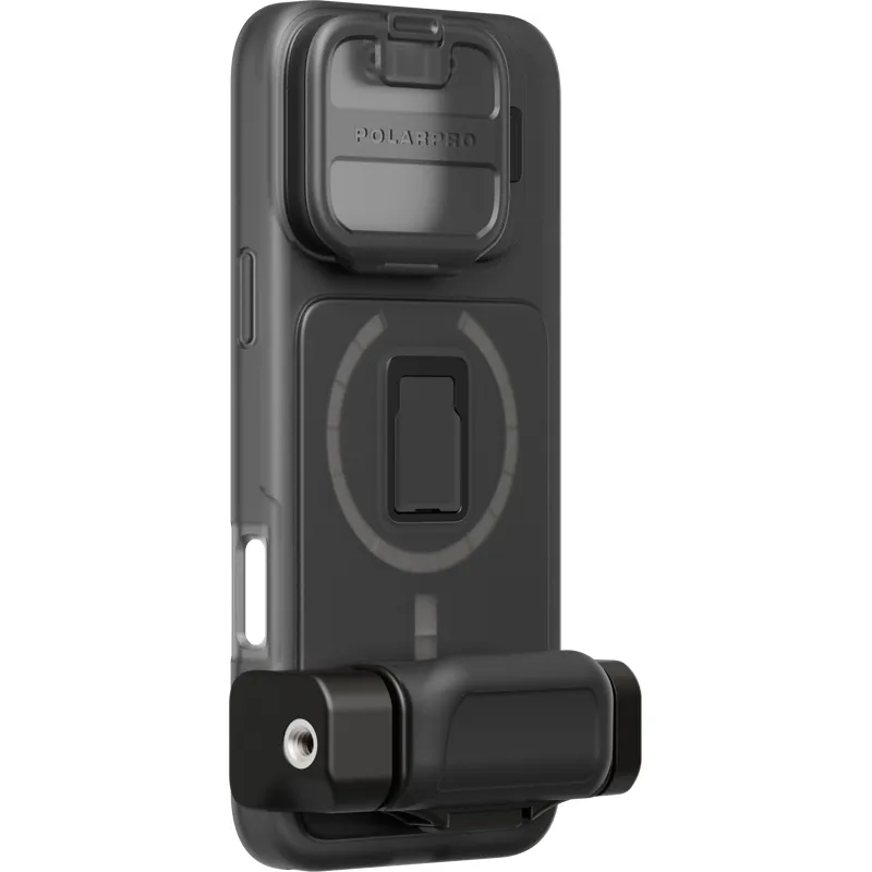 It includes an aluminum cold shoe mount on the back, providing a stable attachment point for the iPhone 16. The new Flip-Down lens protector allows for quick shots without removing the lens. Additionally, the MagSafe array has been made twice as thick and durable for a secure connection with vehicle mounts.