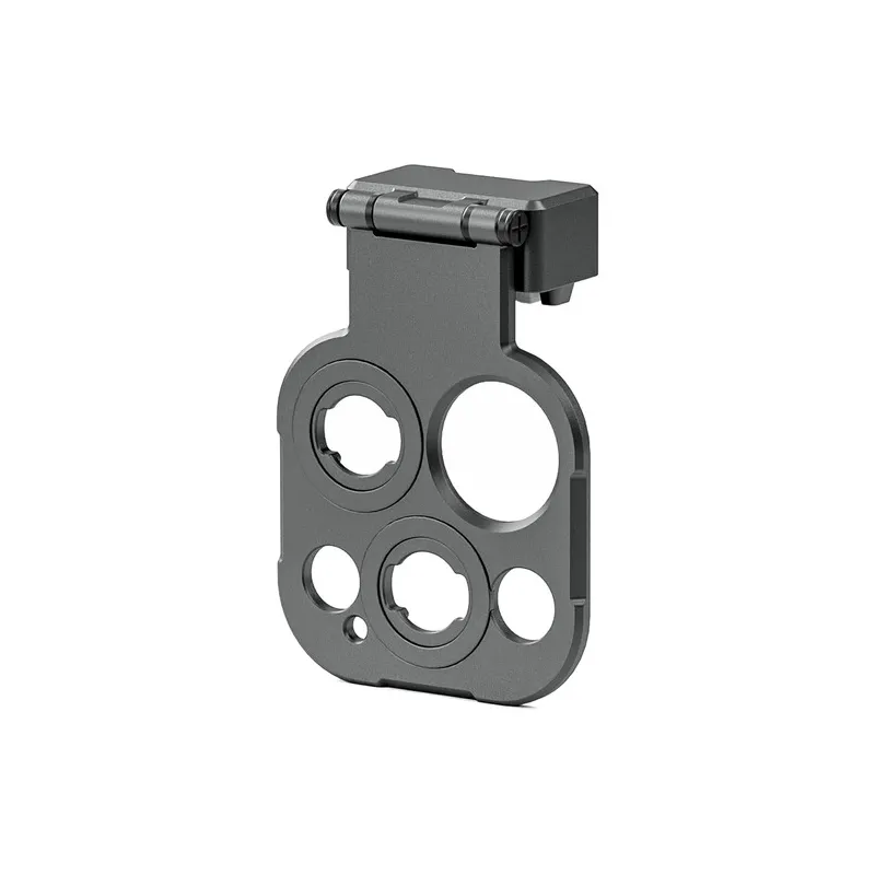 The space gray Khronos M-Series Lens Mount from Tilta allows users to attach M-Series lenses to their Khronos Case for iPhone 15 Pro and Pro Max. This adapter secures in front of your phones lenses with a locking clamp and connects easily to any of the cases mounting points. Simply press the release button, align the pins, and release the button to secure it in place